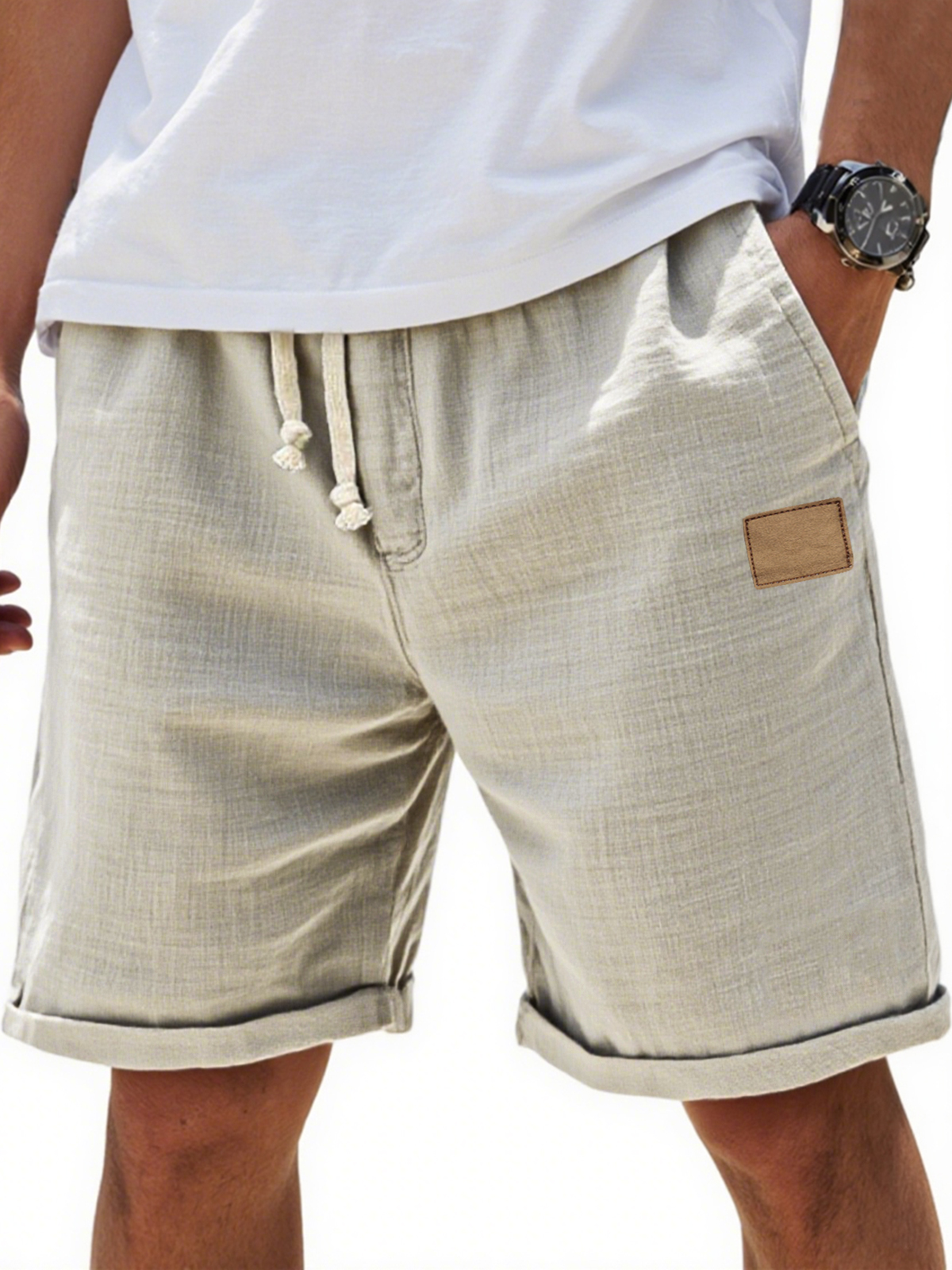 Men's Breathable Cotton and Linen Holiday Lace-Up Everyday Shorts with Embroidered Label