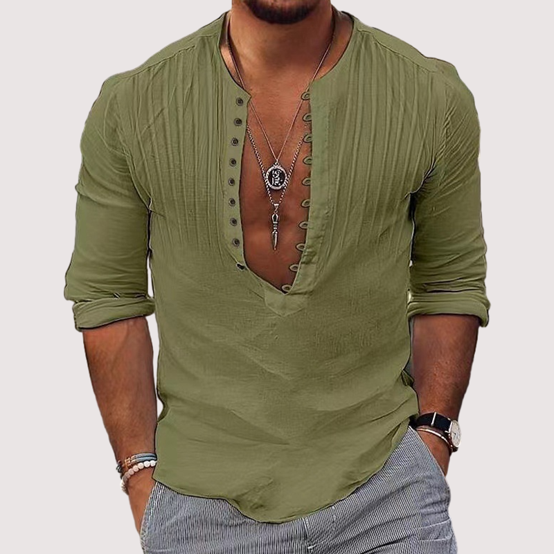 Men's V-Neck Cotton Linen Solid Color Shirt