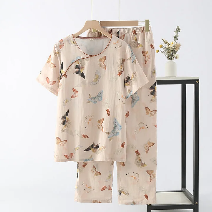 Cotton Gauze Colorful Butterfly Nightwear Set